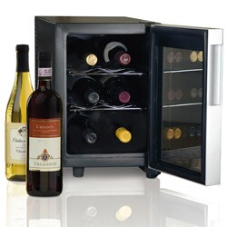 Perfect for all wine enthusiasts, the ultra-quiet 6-bottle wine refrigerator features digital temperature read-out; Kitchen appliance showcases touch sensor control; Wine cooler has an ultra-bright LED lamp for viewing wine bottles; Double-paned glass front door improves insulation; Environmentally friendly thermo-electric cooling system; Two removable chrome shelves; Holds six (6) 750ml wine bottles.